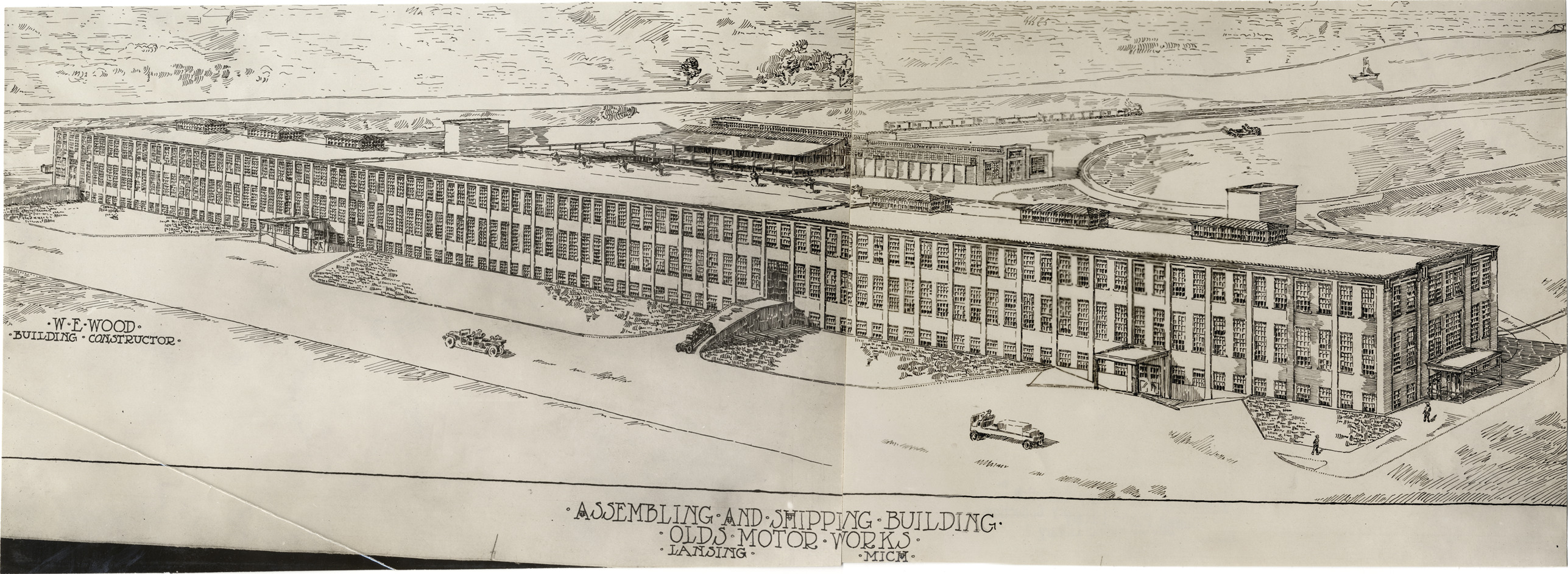 Artist's depiction of the assembling and shipping building of the Olds Motor Works factory in Lansing, Michigan. Printed on front: "Assembling and shipping building, Olds Motor Works, Lansing, Mich., W.E. Wood, building constructor." Handwritten on back: "Companies--Olds Motor Works, Lansing, Mi., 1911."