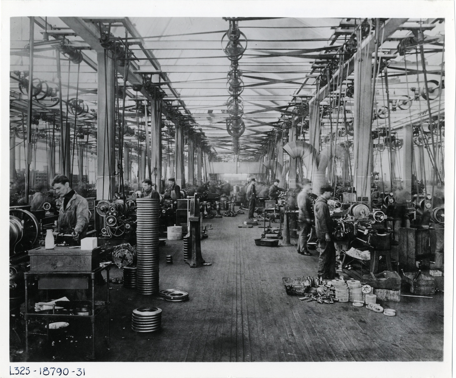 View of men machining small parts in George N. Pierce Company factory. Handwritten on back: "Factories--Pierce-Arrow, 1907. Small parts machining, George N. Pierce Co., Buffalo, NY. Feb. 15, 1907."