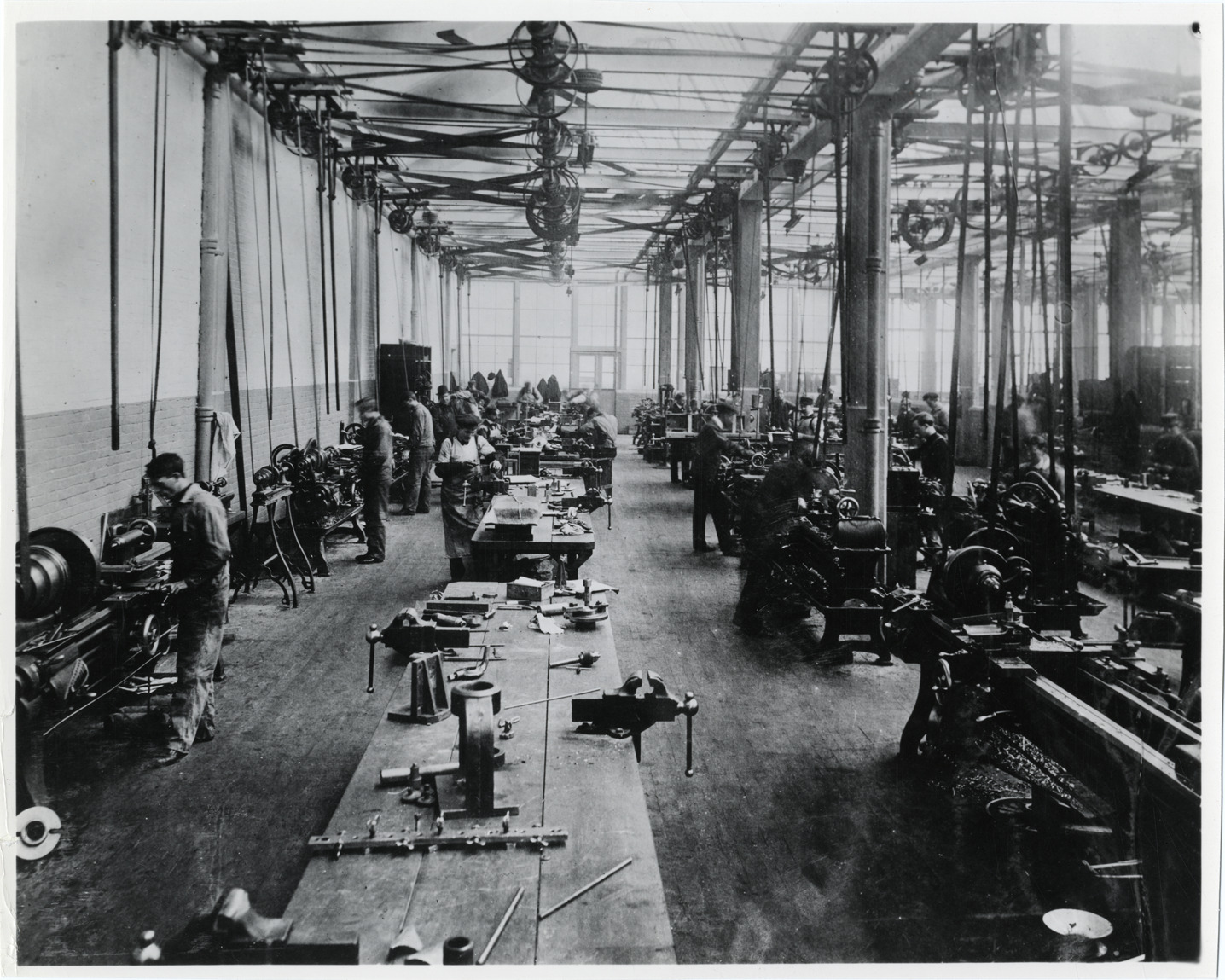 View of men working in Tool Department of George N. Pierce Company factory. Handwritten on back: "Factories--Pierce-Arrow, 1907. Tool Department of the George N. Pierce Co., Buffalo, NY."
