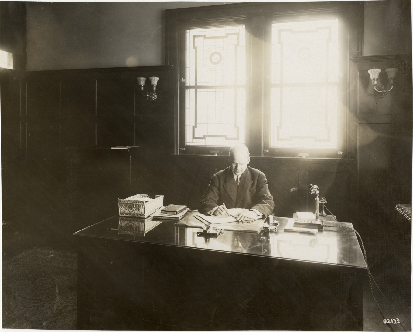 Favorite this☆ Man working at desk in office, Peoples Outfitting Company Description: View of man working at desk in wood-paneled office at Peoples Outfitting Co.; window in background. Handwritten on back: "Companies--Peoples Outfitting Co., 1911." Details Resource ID: na005765 Subject: Businessmen Offices Desks House furnishings industry and trade Photographic prints Date Issued: 1911 Format: 1 photographic print ; 7.25 x 9 in. Member of: National Automotive History Collection Lazarnick Collection Filing Location: Companies--Peoples Outfitting Co. Rights: Physical rights are retained by DPL. Copyright is retained in accordance with U.S. copyright laws.