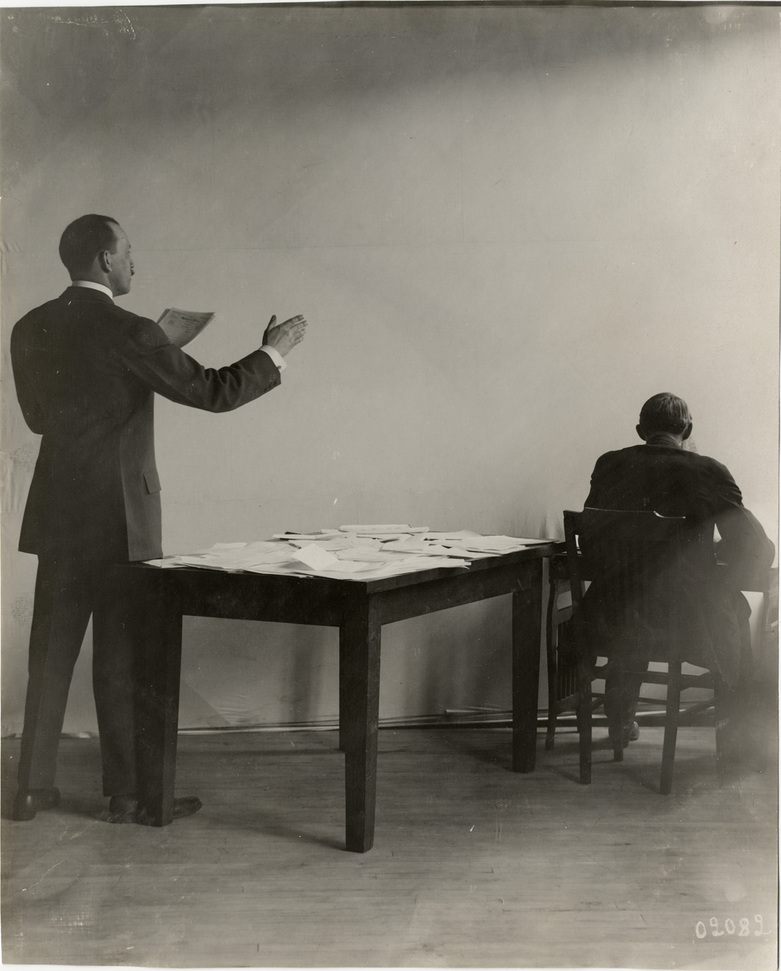 Favorite this☆ Two men in office, Peoples Outfitting Company Description: View of two men in office at Peoples Outfitting Co. One man, holding a document, stands next to table covered with papers; another man sits at small desk in front of blank screen. Handwritten on back: "Companies--Peoples Outfitting Co., 1911." Details Resource ID: na005766 Subject: Businessmen Offices Tables House furnishings industry and trade Photographic prints Date Issued: 1911 Format: 1 photographic print ; 9.25 x 7.5 in. Member of: National Automotive History Collection Lazarnick Collection Filing Location: Companies--Peoples Outfitting Co. Rights: Physical rights are retained by DPL. Copyright is retained in accordance with U.S. copyright laws.