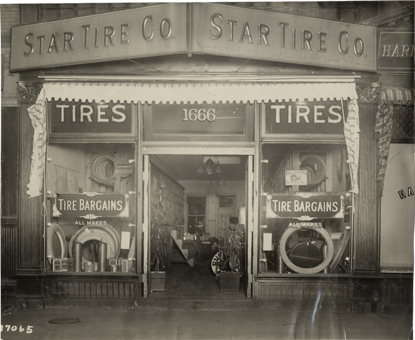 View of storefront windows of Star Tire Company store; interior of store visible through open doors. "Star Tire Co." sign over entrance; "Tire bargains, all makes" painted in windows. Stamped on back: "Spooner & Wells, Inc., photographers, telephones 3472-3473 Columbus, 1931 Broadway, New York." Handwritten on back: "Companies--Star Tire Co., 1910."