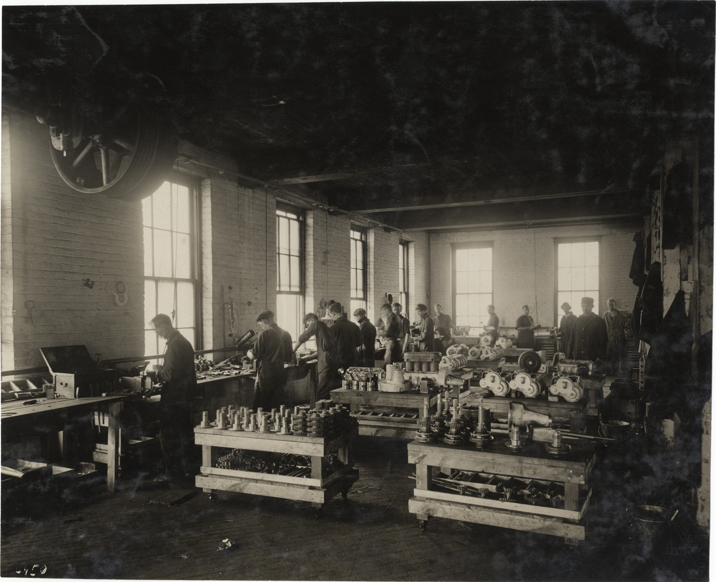 View of workers and equipment inside Welch Motor Car Company factory. Stamped on back: "Spooner & Wells, Inc., photographers, telephone North 1745. 1231 Woodward Ave., Detroit, Mich. Detroit, 1231 Woodward, New York, 1931 Broadway." Handwritten on back: "Companies--Welch Motor Car Co., 1910. Welch factory."