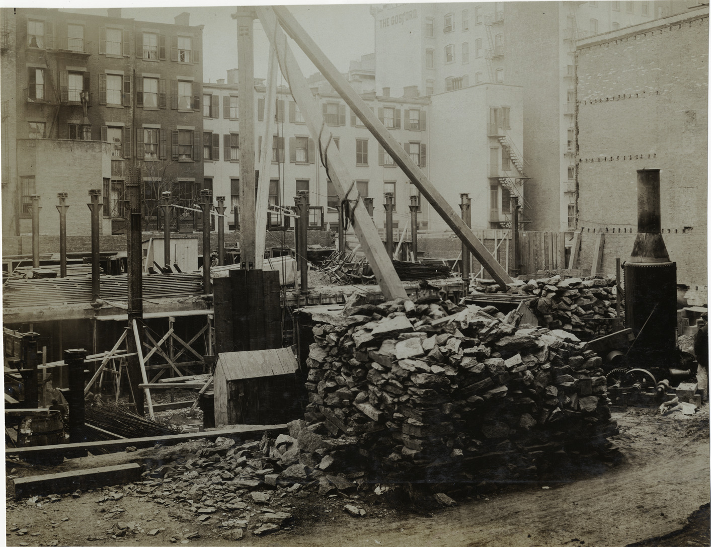 Favorite this☆ Building under construction Description: View of building under construction. Piles of rocks and steam engine in foreground. Stamped on back: "Photo by F. Ed. Spooner, 1536 B'way, telephone 6536-38th St., New York, N.Y." Handwritten on back: "Construction, New York, 1906." Details Resource ID: na005794 Creator: Spooner, F. Ed. Subject: Buildings--New York (State)--New York--Design and construction Building sites--New York (State)--New York Photographers--New York (State)--New York Photographic prints Date Issued: 1906 Format: 1 photographic print ; 7.25 x 9.5 in. Member of: National Automotive History Collection Lazarnick Collection Filing Location: Construction Rights: Physical rights are retained by DPL. Copyright is retained in accordance with U.S. copyright laws.