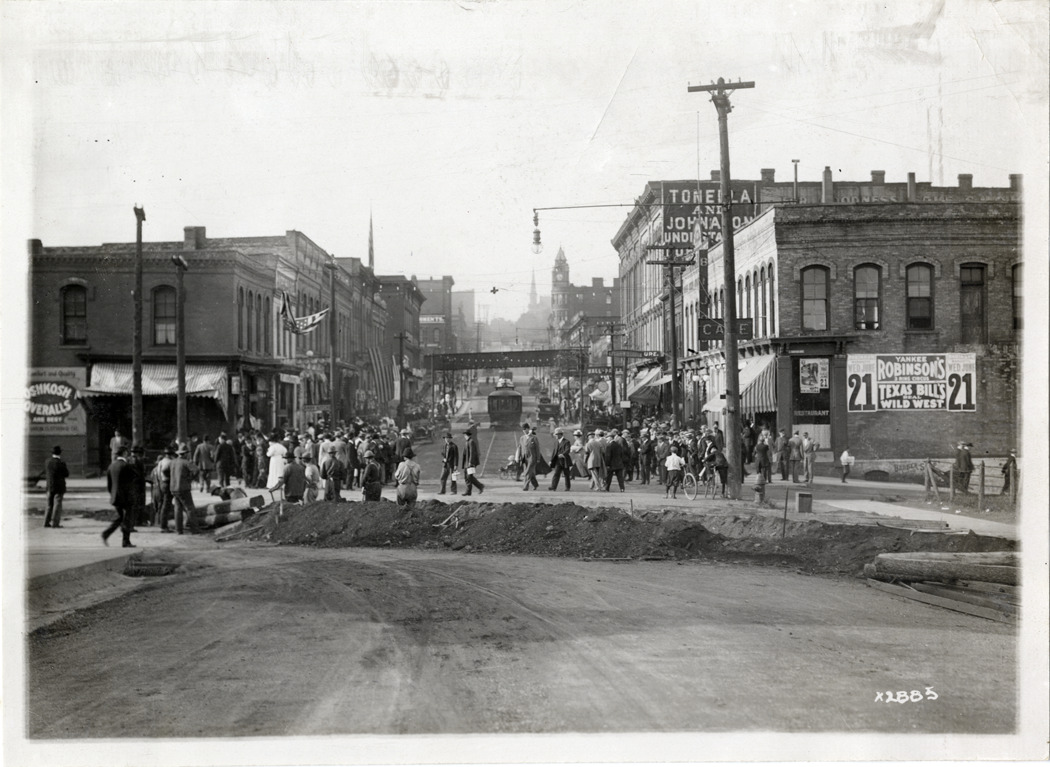 View of men crossing street in Marquette, Michigan during Detroit Board of Commerce Eighth Annual Cruise to Hancock, Houghton and Marquette, Michigan. Handwritten on back: "Conventions--Detroit Board of Commerce, Eighth Annual Cruise, 1911."