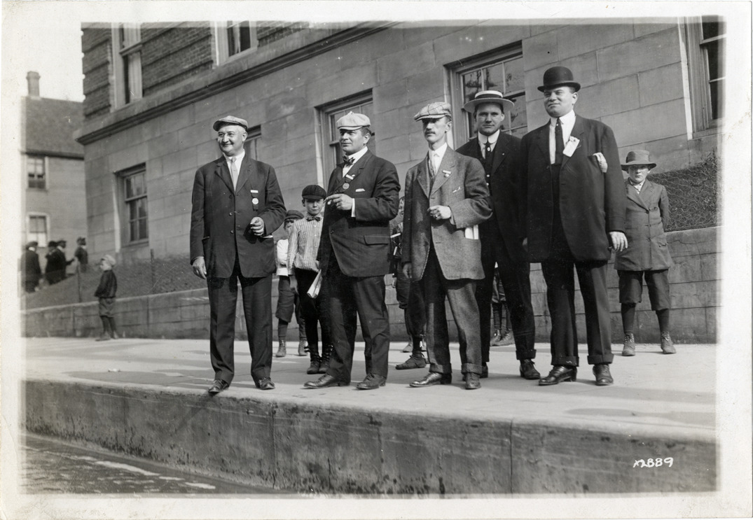 View of several men, wearing suits with ribbons pinned to lapels, at Detroit Board of Commerce Eighth Annual Cruise to Hancock, Houghton and Marquette, Michigan. Group of boys stand in background. Handwritten on back: "Conventions--Detroit Board of Commerce, Eighth Annual Cruise, 1911."
