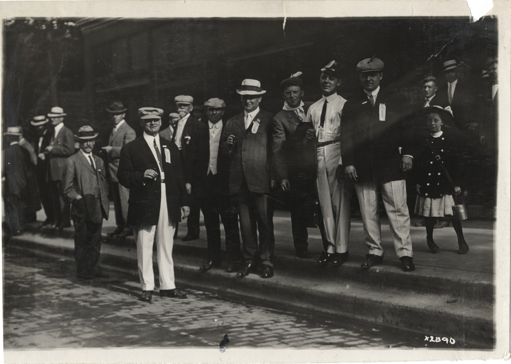 View of group of men, wearing suits with ribbons pinned to lapels, posing on sidewalk during Detroit Board of Commerce Eighth Annual Cruise to Hancock, Houghton and Marquette, Michigan. Young girl stands on right. Handwritten on back: "Conventions--Detroit Board of Commerce, Eighth Annual Cruise, 1911."