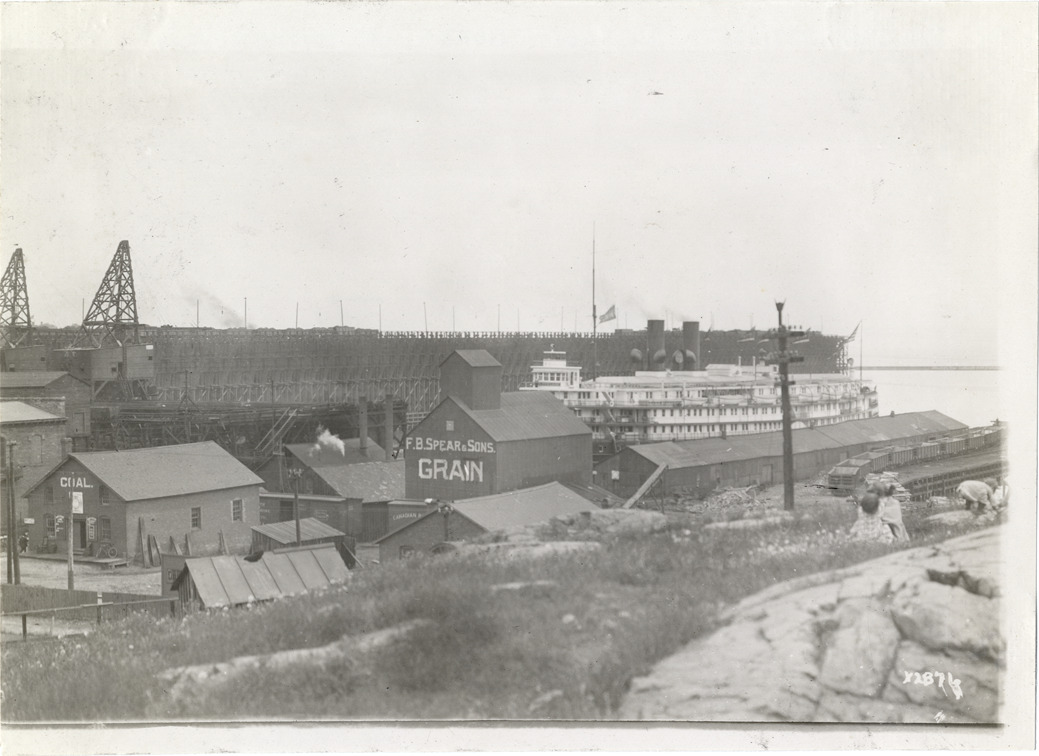 View of F.B. Spear & Sons grain dealer buildings in Marquette during Detroit Board of Commerce Eighth Annual Cruise to Hancock, Houghton and Marquette, Michigan. Ferry docked adjacent to shore; coal building on left. Handwritten on back: "Conventions--Detroit Board of Commerce, Eighth Annual Cruise, 1911."