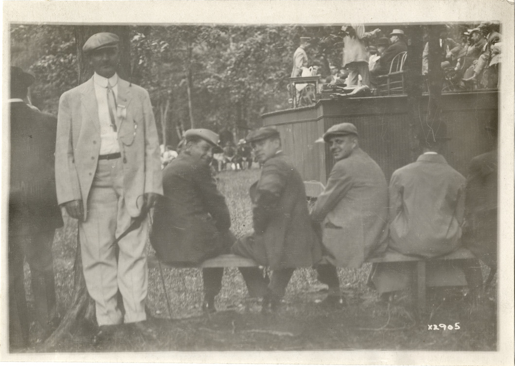 View of men sitting on park bench in park during Detroit Board of Commerce Eighth Annual Cruise to Hancock, Houghton and Marquette, Michigan. Group of men sit on platform in background. Handwritten on back: "Conventions--Detroit Board of Commerce, Eighth Annual Cruise, 1911."