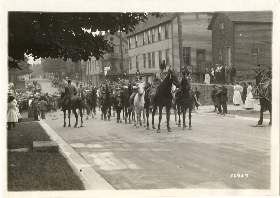 View of group of men, wearing military uniforms, riding horses in procession during Detroit Board of Commerce Eighth Annual Cruise to Hancock, Houghton and Marquette, Michigan. Spectators watch from sidewalk; wooden-frame houses in background. Handwritten on back: "Conventions--Detroit Board of Commerce, Eighth Annual Cruise, 1911."