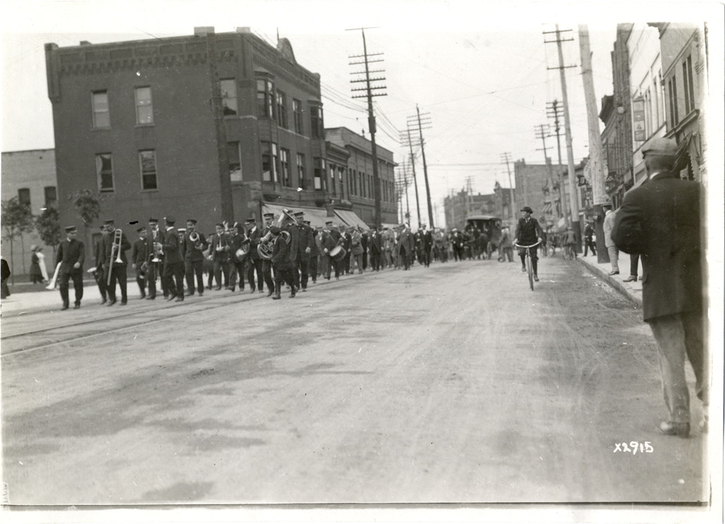 View of Boos' Band and group of men walking in procession during Detroit Board of Commerce Eighth Annual Cruise to Hancock, Houghton and Marquette, Michigan. Bicyclist on right. Handwritten on back: "Conventions--Detroit Board of Commerce, Eighth Annual Cruise, 1911."