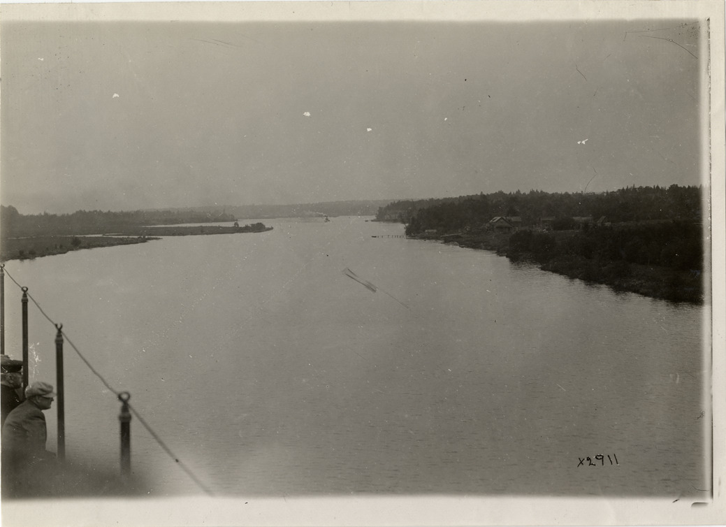 View of river in Upper Peninsula, Michigan during Detroit Board of Commerce Eighth Annual Cruise to Hancock, Houghton and Marquette, Michigan. Handwritten on back: "Conventions--Detroit Board of Commerce, Eighth Annual Cruise, 1911."