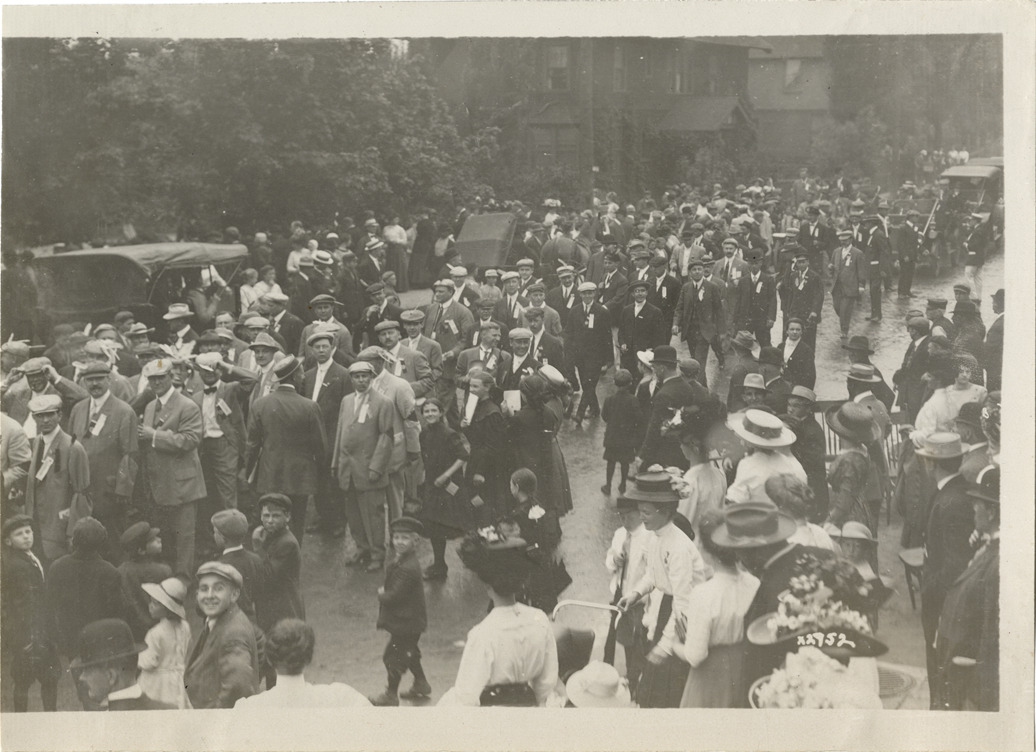 View of crowd of men, wearing suits with ribbons pinned to lapels, walking in center of road during Detroit Board of Commerce Eighth Annual Cruise to Hancock, Houghton and Marquette, Michigan. Group of spectators in foreground. Handwritten on back: "Conventions--Detroit Board of Commerce, Eighth Annual Cruise, 1911."