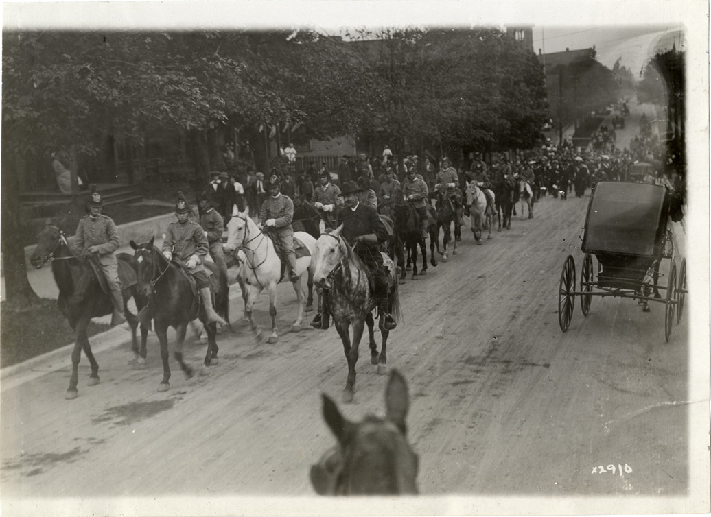 View of group of men, wearing military uniforms, riding horses in procession during Detroit Board of Commerce Eighth Annual Cruise to Hancock, Houghton and Marquette, Michigan. Handwritten on back: "Conventions--Detroit Board of Commerce, Eighth Annual Cruise, 1911."