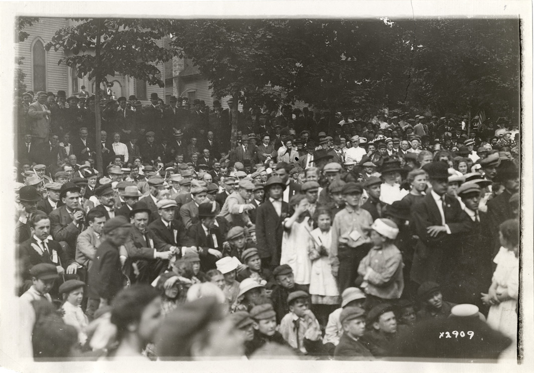 View of crowd of men, women and children in park during Detroit Board of Commerce Eighth Annual Cruise to Hancock, Houghton and Marquette, Michigan. Handwritten on back: "Conventions--Detroit Board of Commerce, Eighth Annual Cruise, 1911."