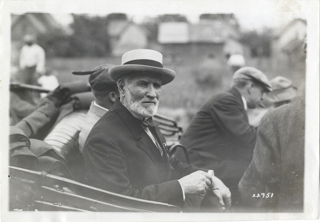 View of Secretary of Agriculture James Wilson riding in car during Detroit Board of Commerce Eighth Annual Cruise to Hancock, Houghton and Marquette, Michigan. Stamped on back: "Spooner & Wells, Inc., photographers, 1231 Woodward Ave., Detroit, Mich., telephone North 1745." Handwritten on back: "Conventions--Detroit Board of Commerce, Eighth Annual Cruise, 1911."