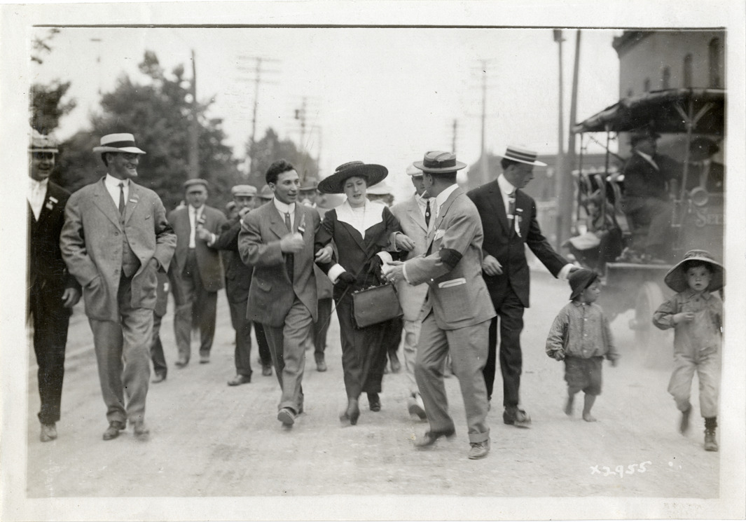 View of two men walking with woman, arms linked, during Detroit Board of Commerce Eighth Annual Cruise to Hancock, Houghton and Marquette, Michigan. Men and children walk with group. Stamped on back: "Spooner & Wells, Inc., photographers, 1231 Woodward Ave., Detroit, Mich., telephone North 1745." Handwritten on back: "Conventions--Detroit Board of Commerce, Eighth Annual Cruise, 1911."