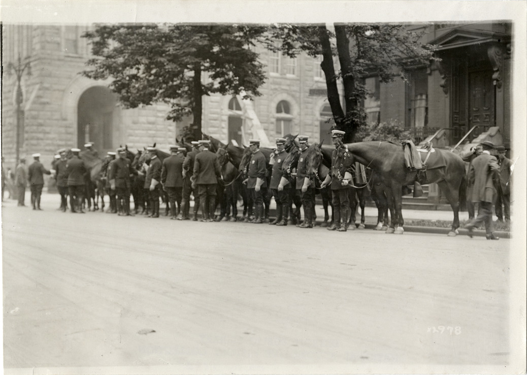 View of mounted policemen at side of street in Detroit, Michigan prior to departure of Detroit Board of Commerce Eighth Annual Cruise to Hancock, Houghton and Marquette, Michigan. Handwritten on back: "Conventions--Detroit Board of Commerce, Eighth Annual Cruise, 1911."
