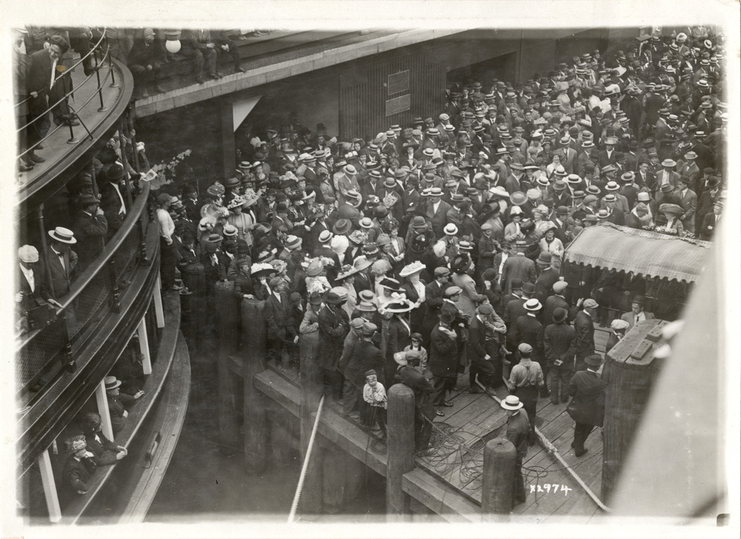 View of crowd on dock prior to departure of Detroit Board of Commerce Eighth Annual Cruise to Hancock, Houghton and Marquette, Michigan. Partial view of ferry on left. Handwritten on back: "Conventions--Detroit Board of Commerce, Eighth Annual Cruise, 1911."