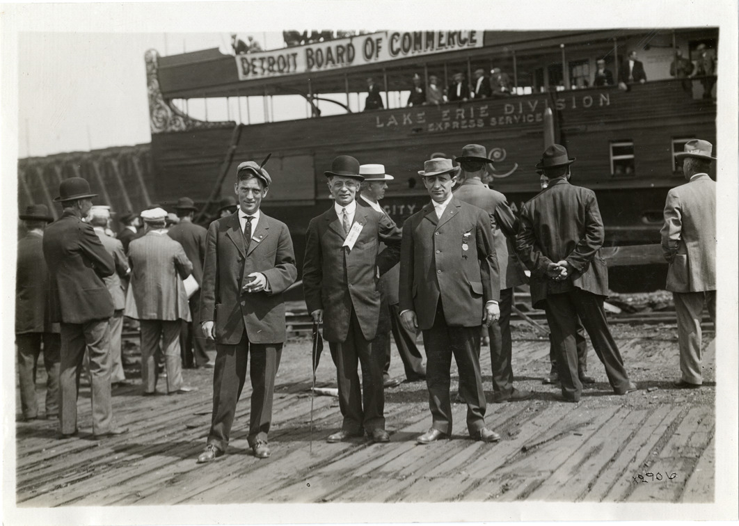 View of three men, wearing suits with badges or ribbons pinned to lapels, posing on dock in front of ferry "City of Cleveland" during Detroit Board of Commerce Eighth Annual Cruise to Hancock, Houghton and Marquette, Michigan. "Detroit Board of Commerce" banner hangs from railing of boat. Handwritten on back: "Conventions--Detroit Board of Commerce, Eighth Annual Cruise, 1911."