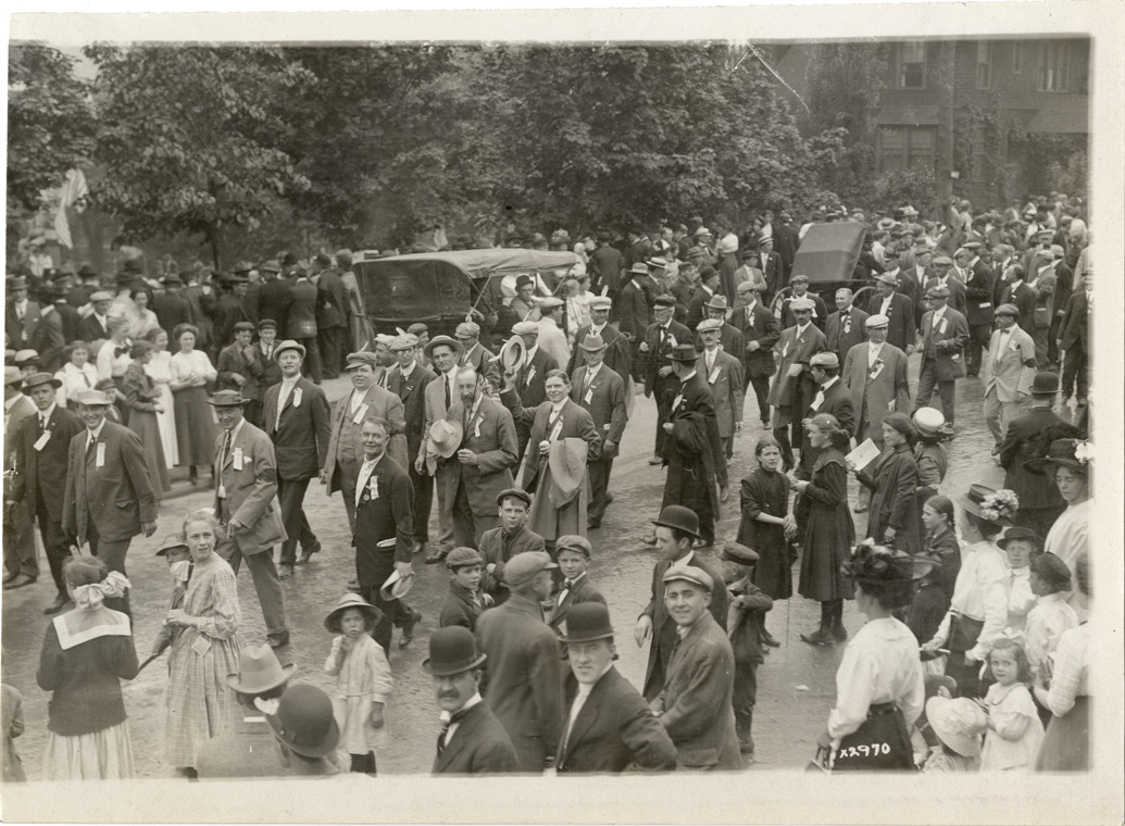View of group of men, wearing suits with badges or ribbons pinned to lapels, walking through crowd during Detroit Board of Commerce Eighth Annual Cruise to Hancock, Houghton and Marquette, Michigan. Handwritten on back: "Conventions--Detroit Board of Commerce, Eighth Annual Cruise, 1911."