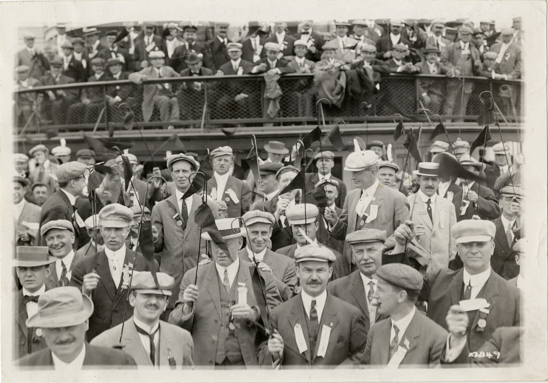 View of men, wearing suits with ribbons pinned to lapels, aboard ferry during Detroit Board of Commerce Eighth Annual Cruise to Hancock, Houghton and Marquette, Michigan. Men hold canes with pennants attached. Stamped on back: "Spooner & Wells, Inc., photographers, 1231 Woodward Ave., Detroit, Mich., telephone North 1745." Handwritten on back: "Conventions--Detroit Board of Commerce, Eighth Annual Cruise, 1911."