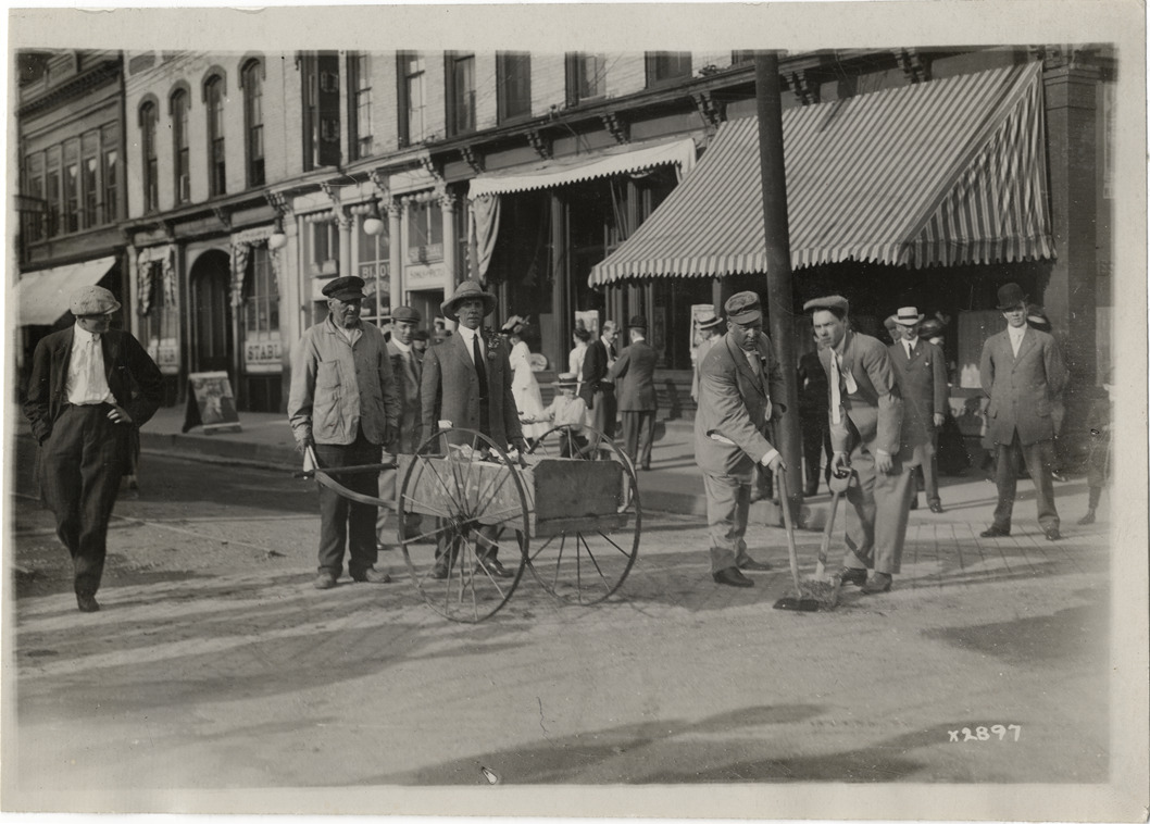 View of men with street sweepers in Marquette, Michigan during Detroit Board of Commerce Eighth Annual Cruise to Hancock, Houghton and Marquette, Michigan. Storefronts in background. Handwritten on back: "Conventions--Detroit Board of Commerce, Eighth Annual Cruise, 1911."