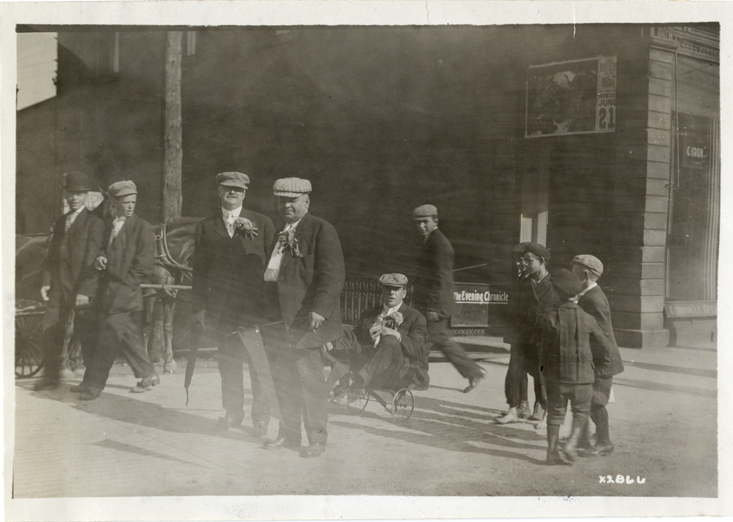 View of man sitting in child's cart during Detroit Board of Commerce Eighth Annual Cruise to Hancock, Houghton and Marquette, Michigan. Group of boys stands on right; two men wearing corsages stand in foreground. Handwritten on back: "Conventions--Detroit Board of Commerce, Eighth Annual Cruise, 1911."