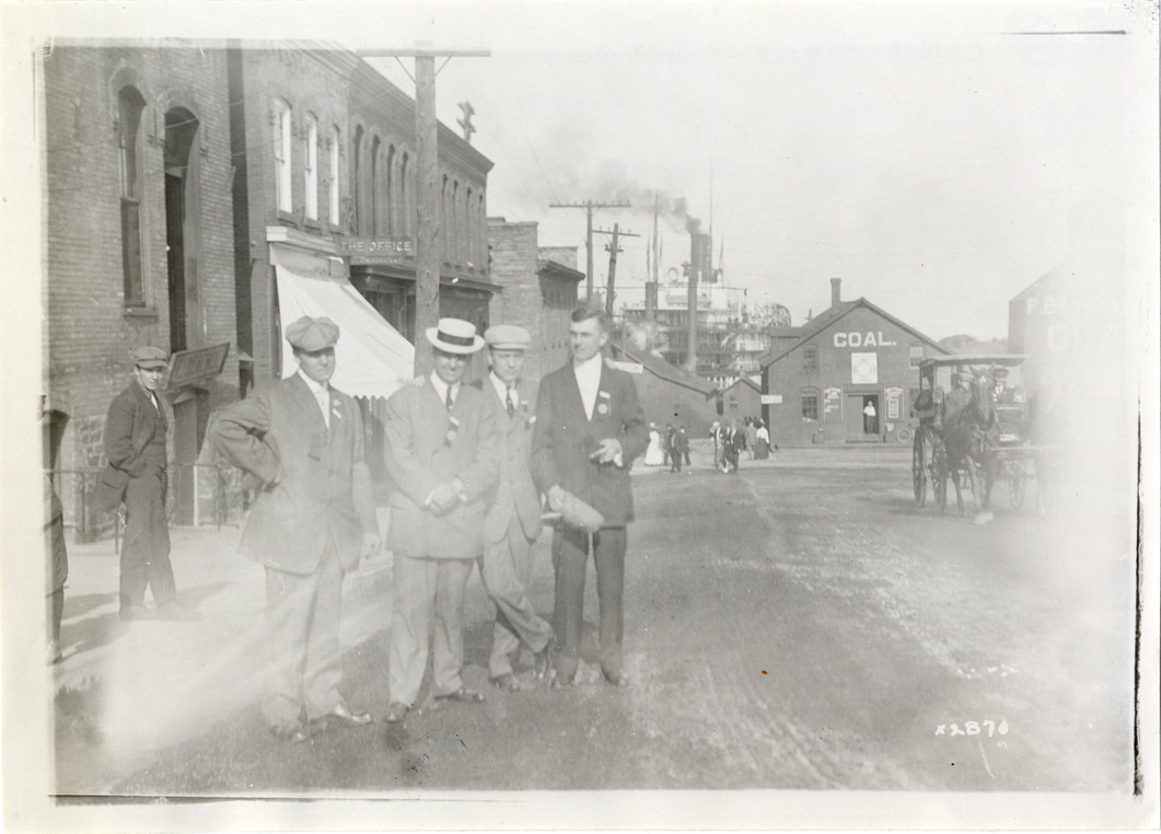 View of several men, wearing suits with ribbons pinned to lapels, posing on street in Marquette during Detroit Board of Commerce Eighth Annual Cruise to Hancock, Houghton and Marquette, Michigan. Ferry, commercial buildings and coal building in background. Handwritten on back: "Conventions--Detroit Board of Commerce, Eighth Annual Cruise, 1911."