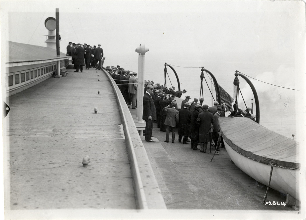 View of group men on deck of ferry, standing near lifeboats during Detroit Board of Commerce Eighth Annual Cruise to Hancock, Houghton and Marquette, Michigan. Handwritten on back: "Conventions--Detroit Board of Commerce, Eighth Annual Cruise, 1911."