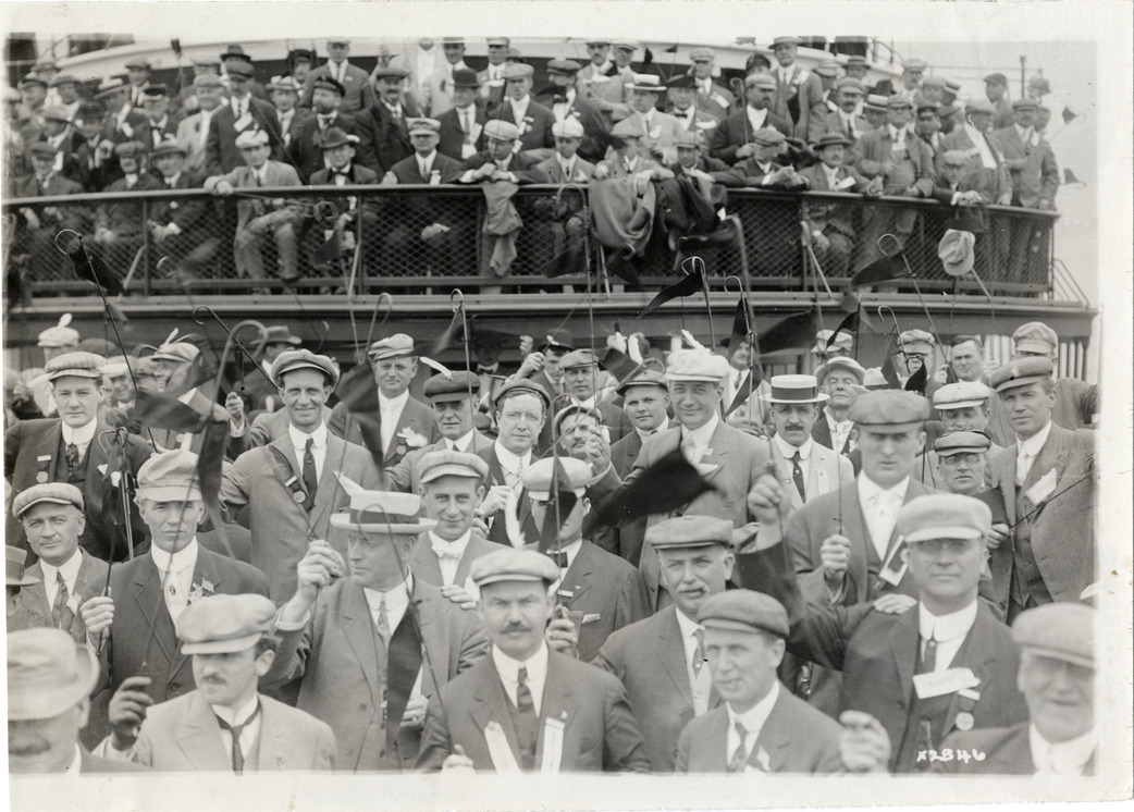View of crowd of men, wearing suits with ribbons pinned to lapels, aboard ferry during Detroit Board of Commerce Eighth Annual Cruise to Hancock, Houghton and Marquette, Michigan. Men hold canes with pennants attached. Handwritten on back: "Conventions--Detroit Board of Commerce, Eighth Annual Cruise, 1911."