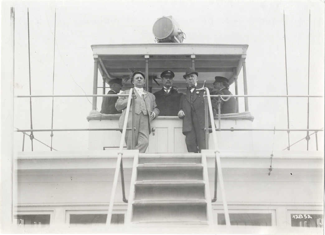 View of U.S. Senator William Alden Smith and unidentified man posing in front of pilothouse of ferry during Detroit Board of Commerce Eighth Annual Cruise to Hancock, Houghton and Marquette, Michigan. Handwritten on back: "Conventions--Detroit Board of Commerce, Eighth Annual Cruise, 1911."