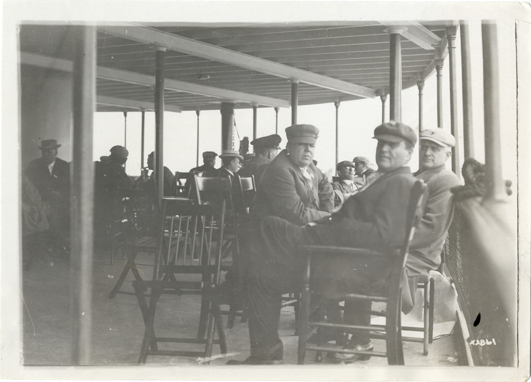 View of group of men on deck of ferry during Detroit Board of Commerce Eighth Annual Cruise to Hancock, Houghton and Marquette, Michigan. Handwritten on back: "Conventions--Detroit Board of Commerce, Eighth Annual Cruise, 1911."