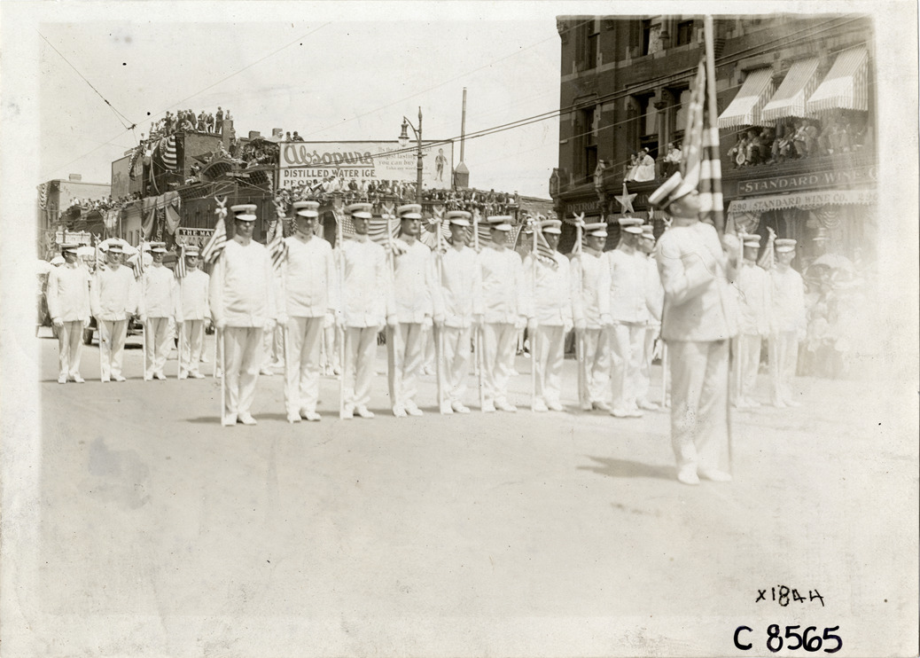 View of group of uniformed men carrying American flags in parade on Woodward Avenue during Elks Club convention, representing Los Angeles Elks lodge. Stamped on back: "Spooner & Wells, Inc., photographers, telephone North 1745. 1231 Woodward Ave., Detroit, Mich. Detroit, 1231 Woodward, New York, 1931 Broadway." Handwritten on back: "Conventions--Elks Club Convention, 1910. Los Angeles Club. Woodward Ave., Detroit, Mi."