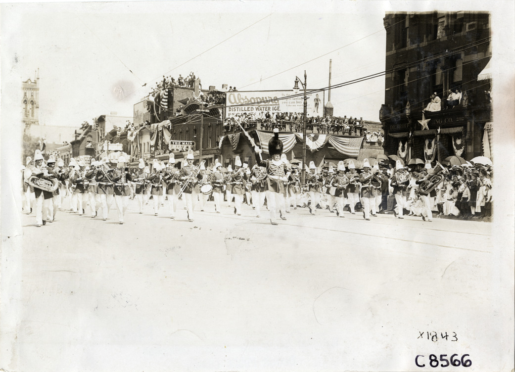View of marching band in parade on Woodward Avenue during Elks Club convention in Detroit, Michigan. Spectators watch from buildings decorated with flags and bunting. Stamped on back: "Spooner & Wells, Inc., photographers, telephone North 1745. 1231 Woodward Ave., Detroit, Mich. Detroit, 1231 Woodward, New York, 1931 Broadway." Handwritten on back: "Conventions--Elks Club Convention, 1910. Woodward Ave., Detroit, Mi."