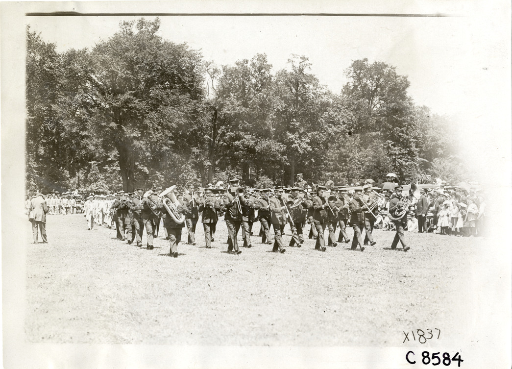 View of marching band in field during Elks Club convention in Detroit, Michigan. Spectators watch from sidelines. Stamped on back: "Spooner & Wells, Inc., photographers, telephone North 1745. 1231 Woodward Ave., Detroit, Mich. Detroit, 1231 Woodward, New York, 1931 Broadway." Handwritten on back: "Conventions--Elks Club Convention, 1910. Band & Detroit Lodge."
