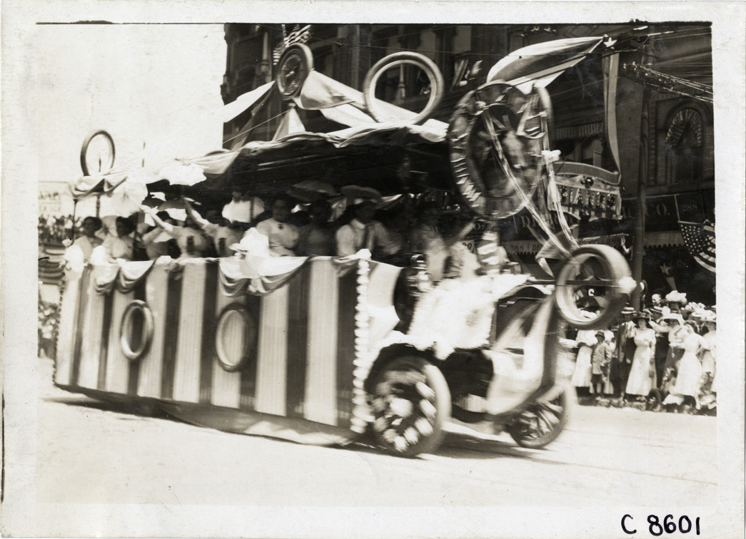 View of float decorated with stripes, tires and clock or sundial with Roman numerals representing Akron, Ohio Elks lodge in parade on Woodward Avenue during Elks Club convention in Detroit, Michigan; women ride in vehicle. Handwritten on back: "Conventions--Elks Club Convention, 1910. Woodward Ave., Detroit, Mi. Akron ladies."