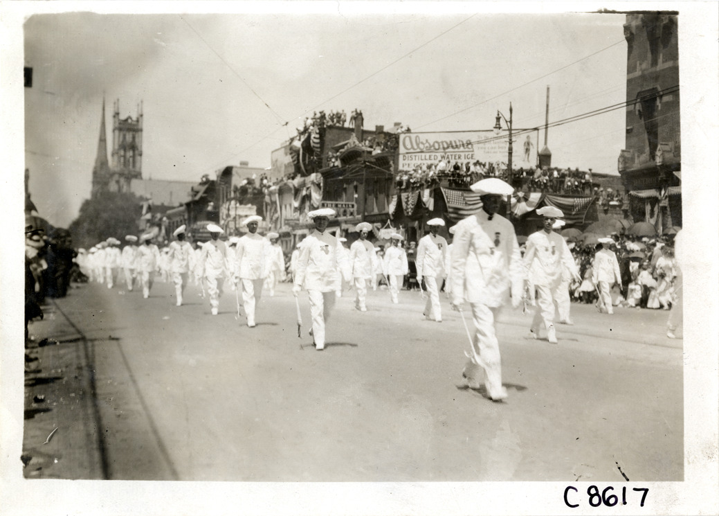 Men marching in parade, Elks Club convention, Detroit, Michigan