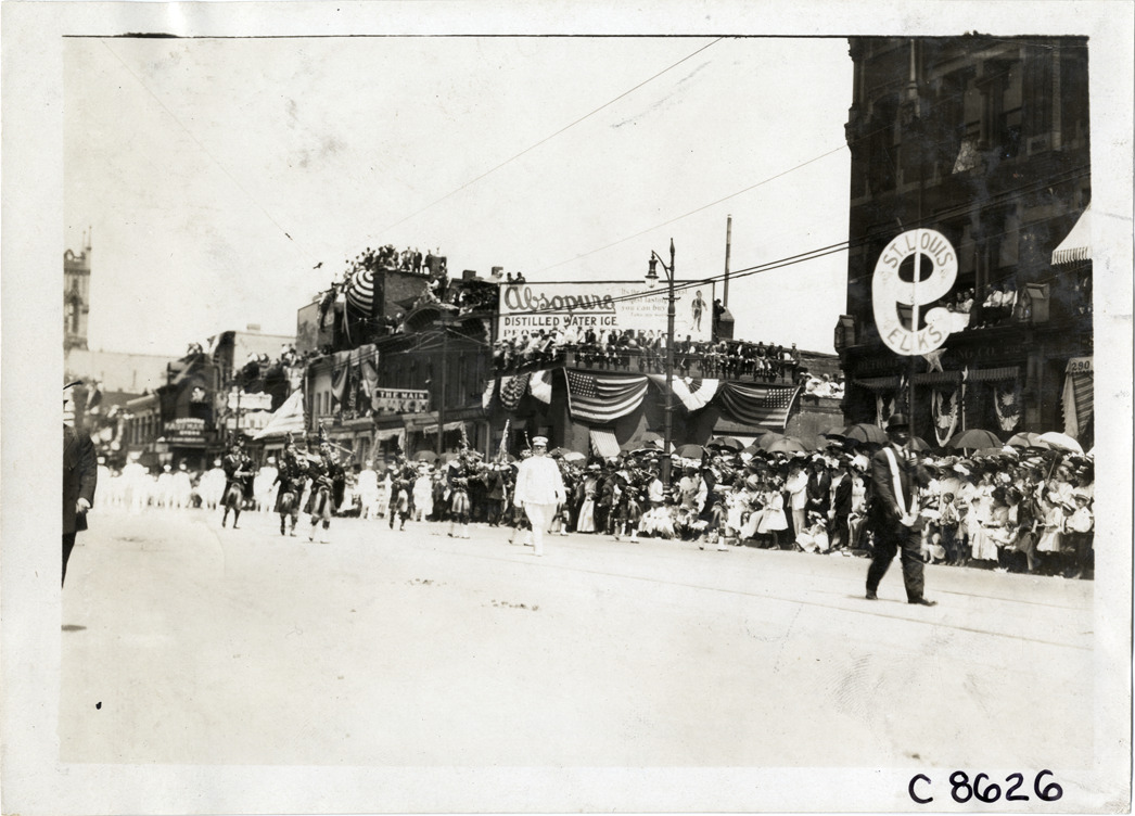 View of man carrying sign for St. Louis, Missouri Elks lodge in parade on Woodward Avenue during Elks Club convention in Detroit, Michigan; sign is in shape of number 9. Spectators watch from buildings and sidewalk. Handwritten on back: "Conventions--Elks Club Convention, 1910. Woodward Ave., Detroit, Mi."