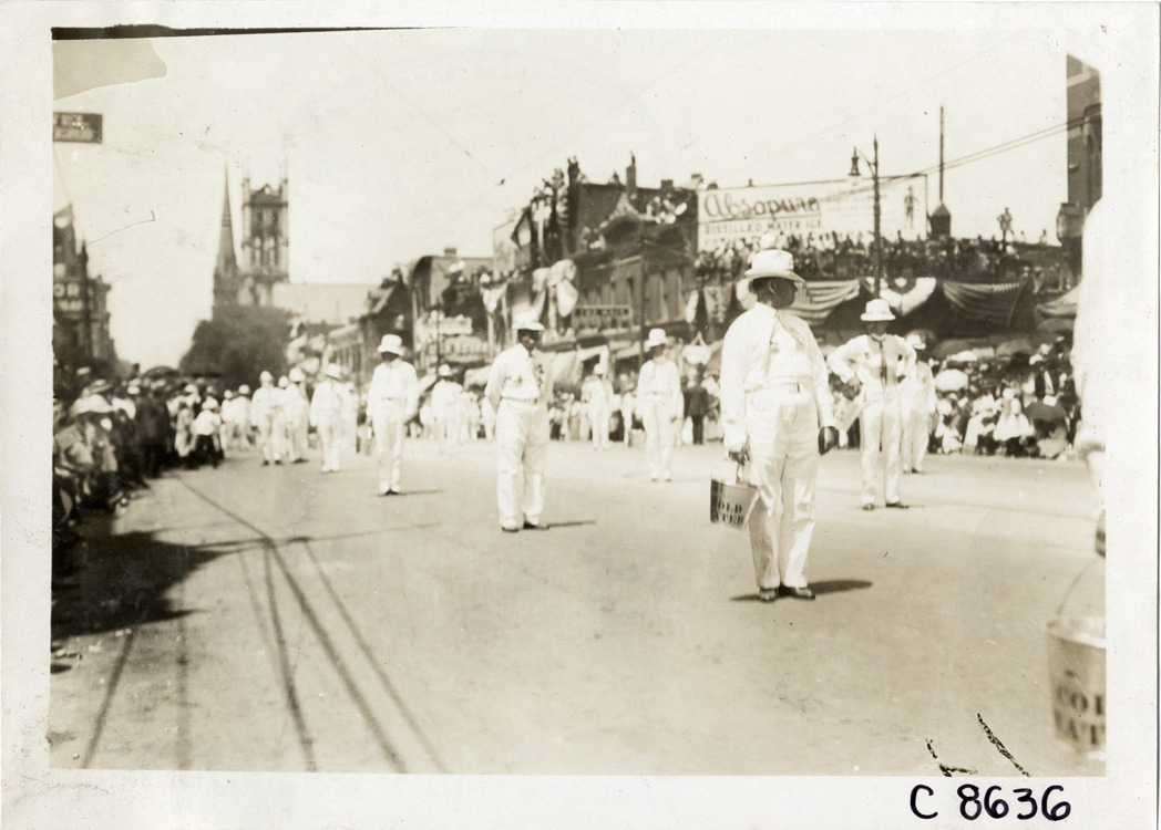 View of men marching in parade on Woodward Avenue during Elks Club convention in Detroit, Michigan; men in foreground hold buckets labled with "Cold water." Spectators watch from buildings and sidewalk. Stamped on back: "Spooner & Wells, Inc., photographers, telephone North 1745. 1231 Woodward Ave., Detroit, Mich. Detroit, 1231 Woodward, New York, 1931 Broadway." Handwritten on back: "Conventions--Elks Club Convention, 1910. Woodward Ave., Detroit, Mi."