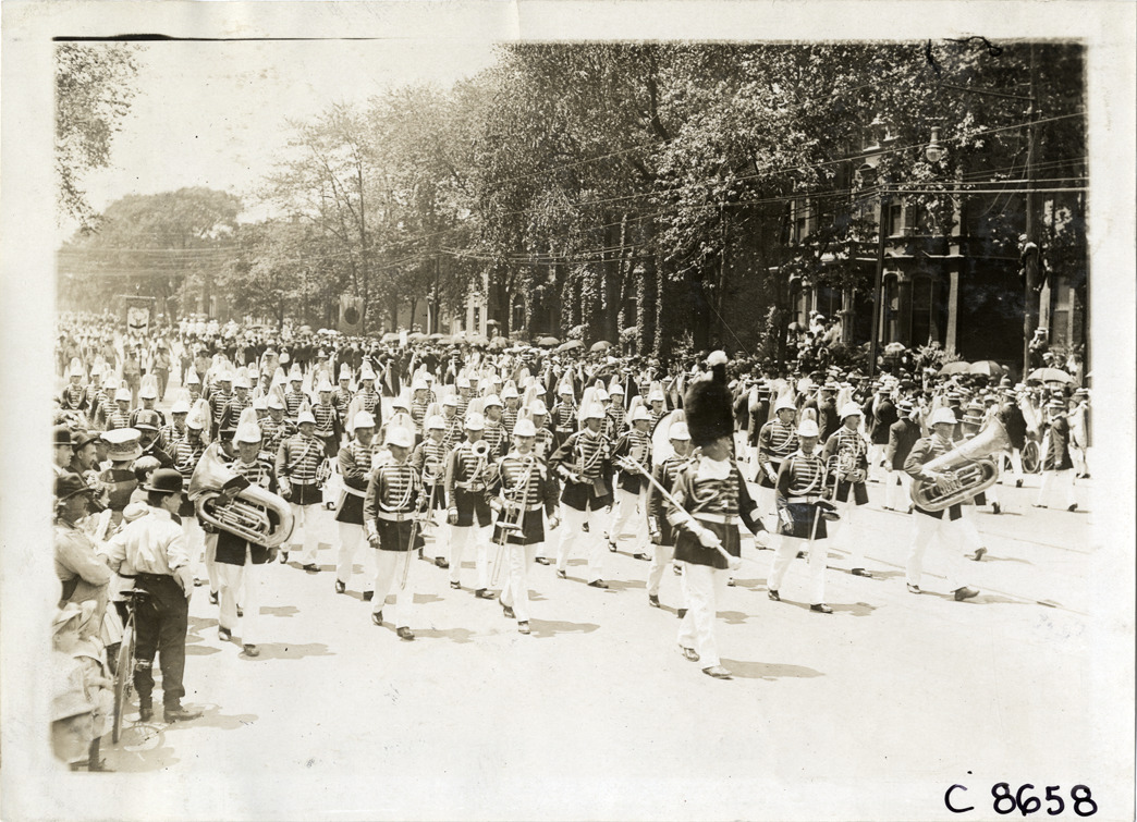 Marching band in parade, Elks Club convention, Detroit, Michigan
