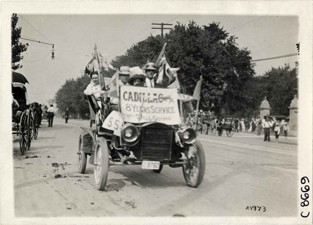 View of Cadillac car in parade during Elks Club convention in Detroit, Michigan. Flags and "Cadillac, 8 years service and still going" sign on car. Stamped on back: "Spooner & Wells, Inc., photographers, telephone North 1745. 1231 Woodward Ave., Detroit, Mich. Detroit, 1231 Woodward, New York, 1931 Broadway." Handwritten on back: "Conventions--Elks Club Convention, 1910. Detroit, Mi."