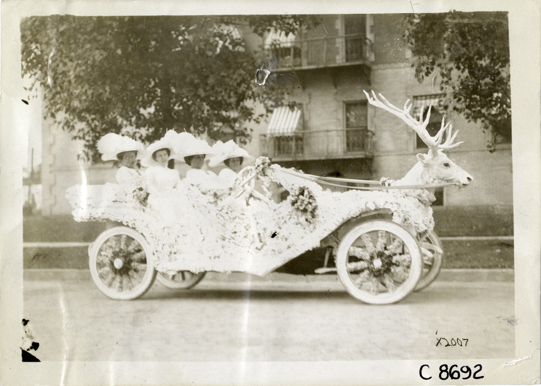 View of car in parade during Elks Club convention in Detroit, Michigan. Car is decorated with elk head and covered with floral decorations. Stamped on back: "Spooner & Wells, Inc., photographers, telephone North 1745. 1231 Woodward Ave., Detroit, Mich. Detroit, 1231 Woodward, New York, 1931 Broadway." Handwritten on back: "Conventions--Elks Club Convention, 1910. Detroit, Mi."