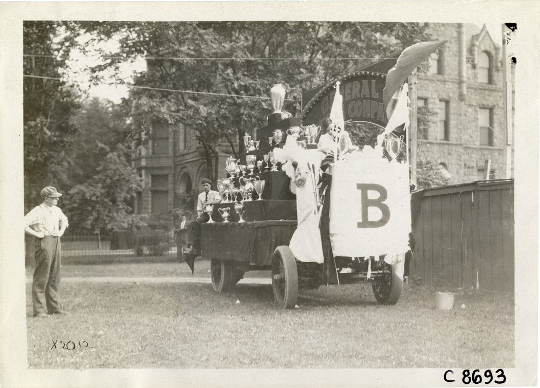 View of truck decorated with trophy cups and "B" banner for parade during Elks Club convention in Detroit, Michigan. Stamped on back: "Spooner & Wells, Inc., photographers, telephone North 1745. 1231 Woodward Ave., Detroit, Mich. Detroit, 1231 Woodward, New York, 1931 Broadway." Handwritten on back: "Conventions--Elks Club Convention, 1910. Detroit, Mi."