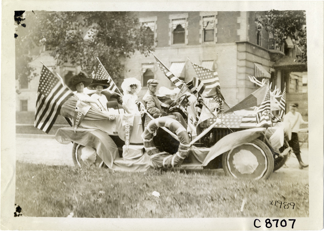 View of car in parade during Elks Club convention in Detroit, Michigan. Car is decorated with American flags, Detroit pennants and elk head. Stamped on back: "Spooner & Wells, Inc., photographers, telephone North 1745. 1231 Woodward Ave., Detroit, Mich. Detroit, 1231 Woodward, New York, 1931 Broadway." Handwritten on back: "Conventions--Elks Club Convention, 1910. Detroit, Mi."
