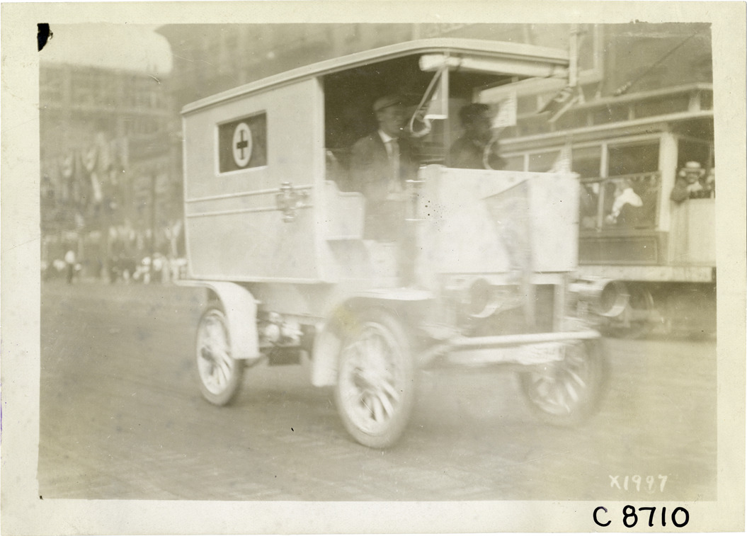 View of truck or ambulance at parade, possibly Red Cross vehicle, during Elks Club convention in Detroit, Michigan. Cross inside circle painted on side of vehicle. Stamped on back: "Spooner & Wells, Inc., photographers, telephone North 1745. 1231 Woodward Ave., Detroit, Mich. Detroit, 1231 Woodward, New York, 1931 Broadway." Handwritten on back: "Conventions--Elks Club Convention, 1910. Detroit, Mi."