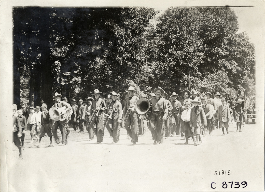 View of cowboy band at Elks Club convention in Detroit, Michigan. Stamped on back: "Spooner & Wells, Inc., photographers, telephone North 1745. 1231 Woodward Ave., Detroit, Mich. Detroit, 1231 Woodward, New York, 1931 Broadway." Handwritten on back: "Conventions--Elks Club Convention, 1910. Detroit, Mi. Cowboy band."