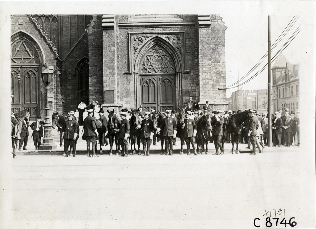 View of mounted police officers and horses posing in front of brick building at Elks Club convention in Detroit, Michigan. Stamped on back: "Spooner & Wells, Inc., photographers, telephone North 1745. 1231 Woodward Ave., Detroit, Mich. Detroit, 1231 Woodward, New York, 1931 Broadway." Handwritten on back: "Conventions--Elks Club Convention, 1910. At Detroit."