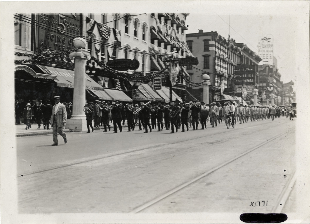 View of marching band in parade during Elks Club convention in Detroit, Michigan. Large columns connected with garlands decorate side of street. Stamped on back: "Spooner & Wells, Inc., photographers, telephone North 1745. 1231 Woodward Ave., Detroit, Mich. Detroit, 1231 Woodward, New York, 1931 Broadway." Handwritten on back: "Conventions--Elks Club Convention, 1910. At Detroit. Elks Club convention."