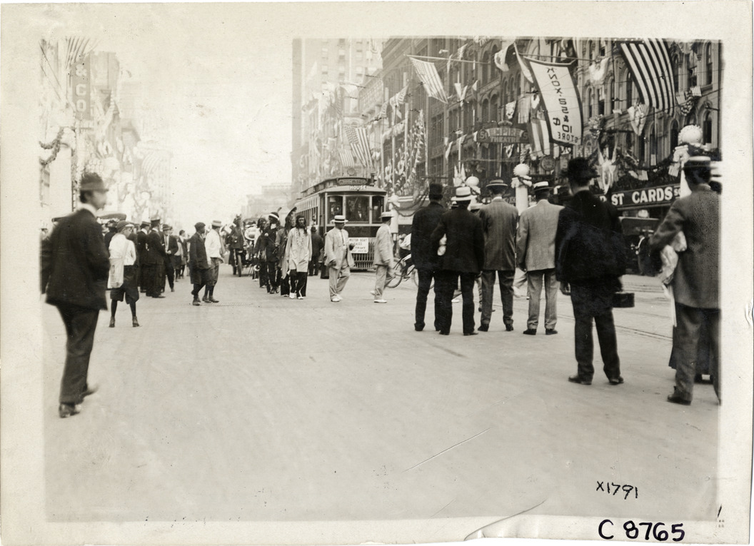 View of parade during Elks Club convention in Detroit, Michigan. Stamped on back: "Spooner & Wells, Inc., photographers, telephone North 1745. 1231 Woodward Ave., Detroit, Mich. Detroit, 1231 Woodward, New York, 1931 Broadway." Handwritten on back: "Conventions--Elks Club Convention, 1910. At Detroit."